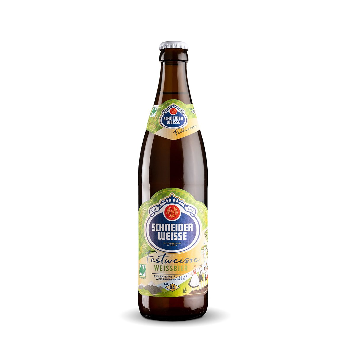 Schneider Festweisse Tap 4, cerveza de trigo alemana con notas de plátano y clavo. Tradición cervecera de Kelheim en cada sorbo.